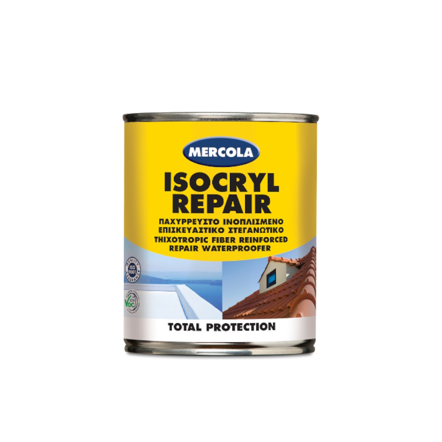 - Το ISOCRYL REPAIR είναι υψηλών προδιαγραφών ελαστομερές, παχύρρευστο επαλειφόμενο, υδατοδιαλυτό, ινοπλισμένο στεγανωτικό υλικό, 1 συστατικού, καθαρής ακρυλικής βάσης, με εξαιρετική αντοχή στις καιρικές συνθήκες. Εφαρμόζεται σε ειδικά σημεία που χρειάζεται να απλωθεί υλικό για προστασία από την υγρασία όπως γωνίες, κεραμίδια, μεταλλικές βάσεις στήριξης σε ταράτσες και κάθε μέρος στο οποίο δεν είναι εύκολη η εφαρμογή μονωτικού ταράτσας και χρειάζεται πλούσιο υλικό με εξαιρετική ελαστικότητα, πρόσφυση και συγκολλητικότητα για την κάλυψη επικίνδυνων και ελαττωματικών σημείων και ρωγμών.