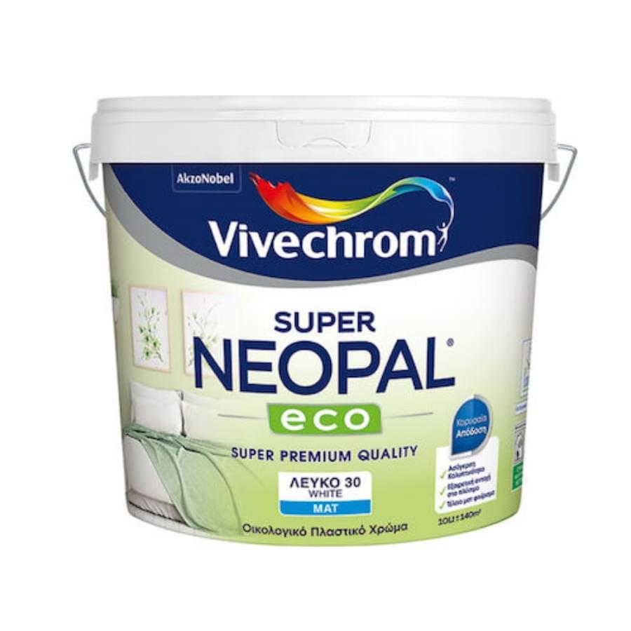 Το SUPER NEOPAL ECO είναι οικολογικό ματ πλαστικό χρώμα ασυναγώνιστης ποιότητας. Είναι πιστοποιημένο από το AFNOR και πληροί τα κριτήρια του οικολογικού σήματος Ecolabel της Ε.Ε. Δεν περιέχει αμμωνία ούτε επικίνδυνες ουσίες όπως βαρέα μέταλλα, ελεύθερη φορμαλδεΰδη, αρωματικούς υδρογονάνθρακες και είναι φιλικό προς το χρήστη και το περιβάλλον. Είναι απολύτως ασφαλές, συμβάλλει στην καλύτερη ποιότητα εσωτερικού αέρα (French VOC Regulation A+) και είναι ιδανικό για χώρους που κατοικούνται. Διακρίνεται για την ασύγκριτη καλυπτικότητα και απόδοση, την υψηλή του λευκότητα και τις αναλλοίωτες αποχρώσεις, και έχει εξαιρετική αντοχή στο συχνό πλύσιμο (Class 1, EN 13300). Εφαρμόζεται σε σοβά, μπετόν, τούβλα, ξύλα. Δουλεύεται εύκολα, έχει ισχυρή πρόσφυση και γρήγορο στέγνωμα. Απλώνει θαυμάσια και δημιουργεί εξαιρετικό μάτ φινίρισμα. Εμποδίζει την ανάπτυξη της φωτιάς και την εξάπλωση της φλόγας.
